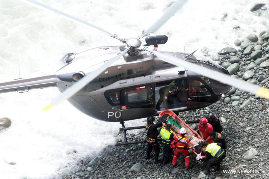 Rescue personnel transfer an injured person of a bus accident in Pasamayo, north of Lima, capital of Peru, on Jan. 2, 2018. At least 25 people were killed near Peru's capital on Tuesday when their bus plummeted 400 meters off a highway and into a gorge, the Highway Police (POLCAR) said. (Xinhua/ANDINA/Vidal Tarqui)