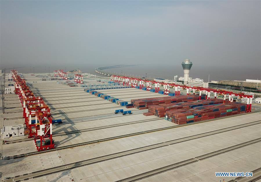 Photo taken on Dec. 10, 2017 shows the Phase IV of Shanghai Yangshan Deep Water Port in Shanghai, east China. Located at the south of Donghai Bridge, phase IV of the Yangshan Port, the world's biggest automated container terminal, started trial operations on Dec. 10, 2017. It covers 2.23 million square meters and has a 2,350-meter shoreline. Once it enters full operation, the fourth phase of the Yangshan Port will initially be able to handle 4 million TEUs (twenty-foot equivalent units). The number will expand to 6.3 million TEUs at a later stage. (Xinhua/Ding Ting)