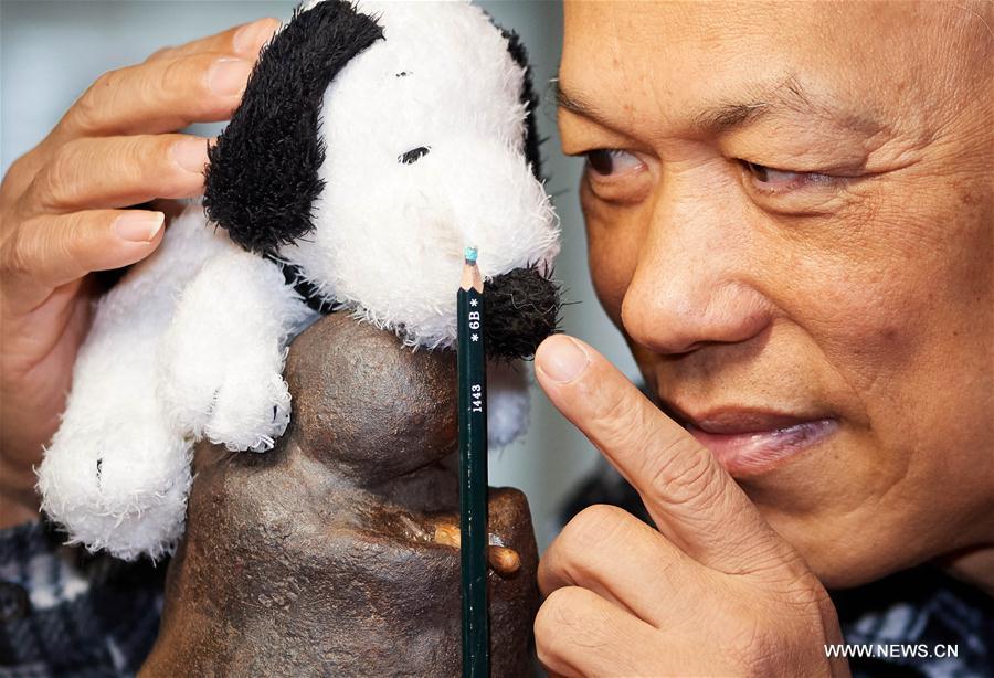 Artist Chen Forng Shean looks at his miniature sculpture in Taipei, southeast China's Taiwan, Dec. 18, 2017. Chen Forng Shean, a sculpture artist in Taiwan, made a miniature dog sculpture with resin material. Chen made the sculpture to greet the Year of the Dog. (Xinhua/Zhao Yingquan)?
