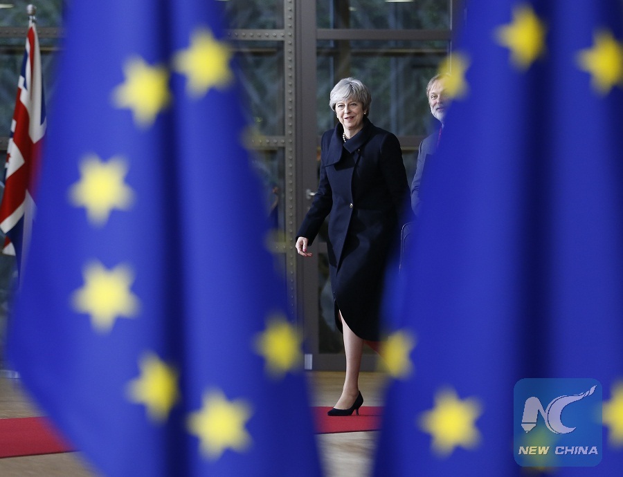 British Prime Minister Theresa May arrives at the EU headquarters for an EU Summit in Brussels, Belgium, Dec. 14, 2017. (Xinhua/Ye Pingfan)