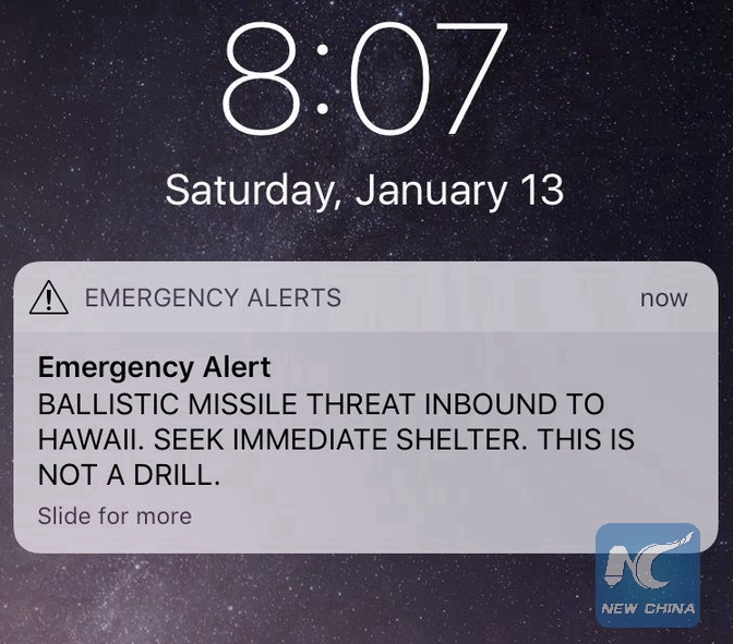 LOS ANGELES, Jan. 13 (Xinhua) -- An emergency text alert on Saturday warning residents in the U.S. state of Hawaii of an imminent ballistic missile threat was false alarm sent out due to human error, state officials said.