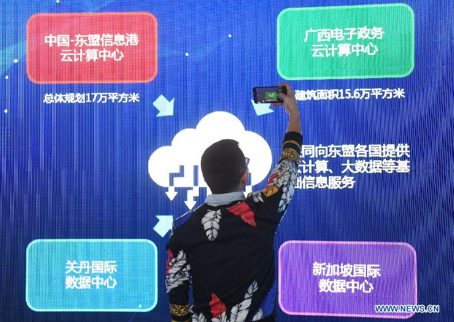 A visitor takes pictures at China-ASEAN Information Port in south China's Guangxi Zhuang Autonomous Region, Jan. 15, 2018. By making full use of its geographical location and the potential of coastlines and border areas, Guangxi capitalized on its advantages and played a bigger role in the Belt and Road Initiative. Through ports and the Beibu Gulf Economic Zone, the trade cooperation between Guangxi and ASEAN countries gained great prospects. (Xinhua/Lu Boan)