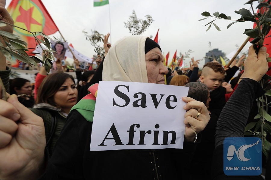DAMASCUS, Feb. 5 (Xinhua) -- As many as 500 people have been killed and wounded during the two-week-long Turkish military campaign against the Kurdish-held Afrin region in northern Syria, state news agency SANA reported on Monday.