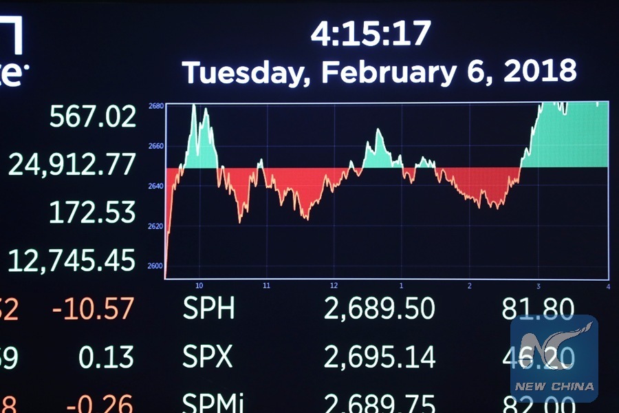 An electronic screen displaying trading data is seen at the New York Stock Exchange in New York, the United States, Feb. 6, 2018. U.S. stocks closed higher after a volatile trading session on Tuesday. The Dow Jones Industrial Average added 567.02 points, or 2.33 percent, to 24,912.77. The S&P 500 increased 46.20 points, or 1.74 percent, to 2,695.14. The Nasdaq Composite Index was up 148.36 points, or 2.13 percent, to 7,115.88. (Xinhua/Wang Ying)