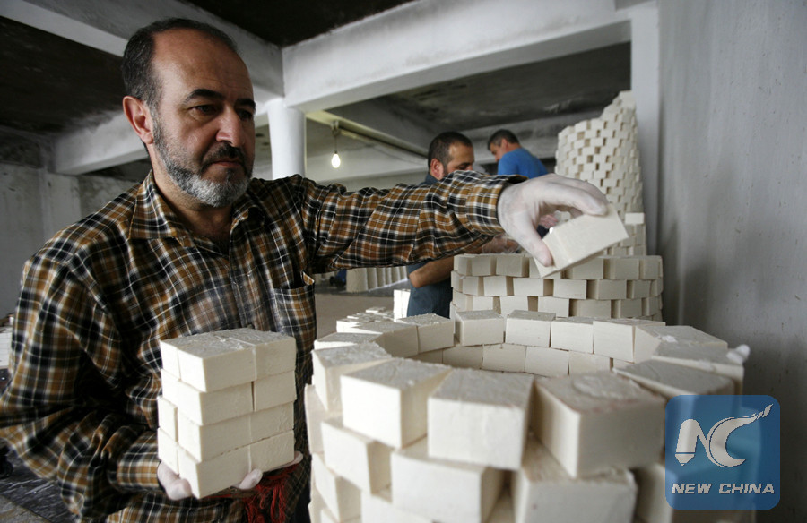 (File photo)A Palestinian worker holds soap pieces at the Touqan factory in the West Bank city of Nablus, on Oct. 8, 2012. The Touqan factory is one of the oldest manual factories in Nablus that manufactures the natural "Nabulsi Soap" since 1894. (Xinhua/Ayman Nobani)