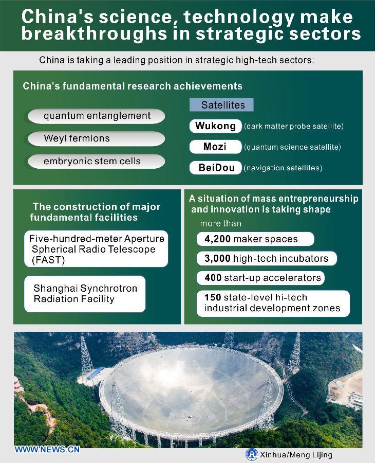 The graphic shows China is taking a leading position in strategic high-tech sectors, such as space, deep-sea, super-computing and nuclear energy, Minister of Science and Technology said on March, 10, 2018. (Xinhua/Meng Lijing)