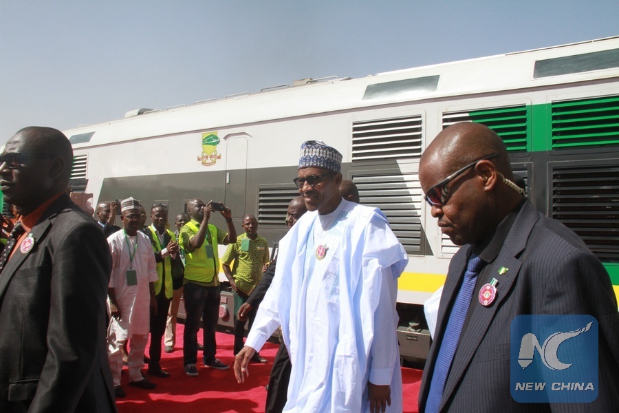Nigerian President Muhammadu Buhari (2nd R) attends the commissioning of Locomotives in Kaduna, Nigeria, Jan. 4, 2018. Muhammadu Buhari on Thursday inaugurated 10 additional coaches and two locomotive engines to the existing ones to boost the country's first completed standard gauge railway modernization project assisted by China. (Xinhua)