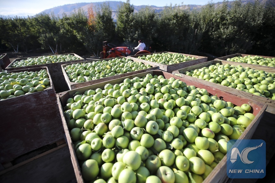 Containers full of granny smith apples are seen in an apple orchard of Auvil Fruit Company in Wenatchee, Washington State, the United States, on Nov. 3, 2017. China has become one of Auvil's biggest overseas markets for its apples and cherries in recent years since the company learned about the B2C platform Tmall. (Xinhua/Wang Ying)