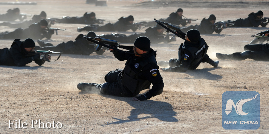 Chinese and Russian policemen attend a joint anti-terror drill in Manzhouli City, north China's Inner Mongolia Autonomous Region, Oct. 20, 2014. (Xinhua/Zhang Ling)