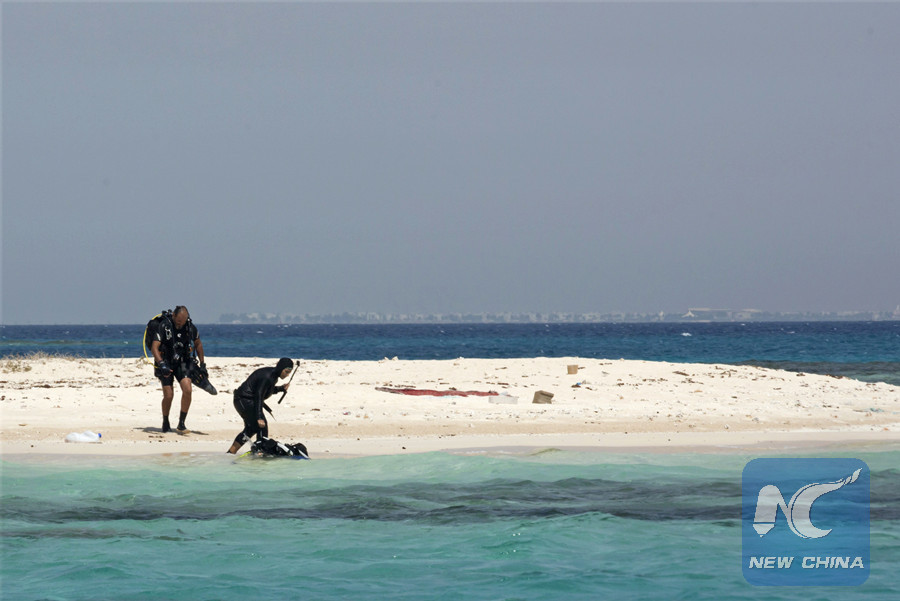 In this March 7, 2018 photo, Nouf Alosaimi, a 29-year-old female Saudidive instructor, right, and Tamer Nasr, an Egyptian diving instructor explore a sandy island in the Red Sea after a dive, near King Abdullah Economic City, Saudi Arabia. (AP Photo/Amr Nabil)