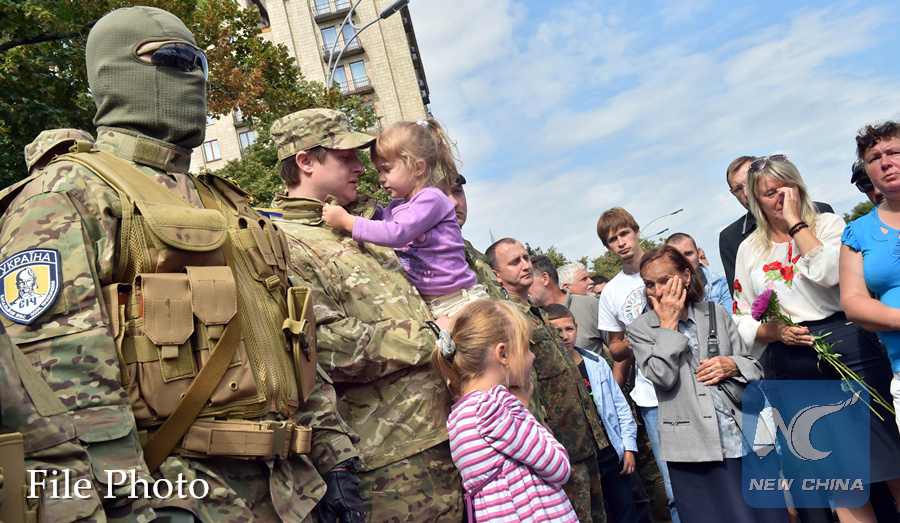 A Sich special volonteer battalion member holds his children on August 26, 2014 during an oath-taking and farewell ceremony in Kiev. (Xinhua/AFP)