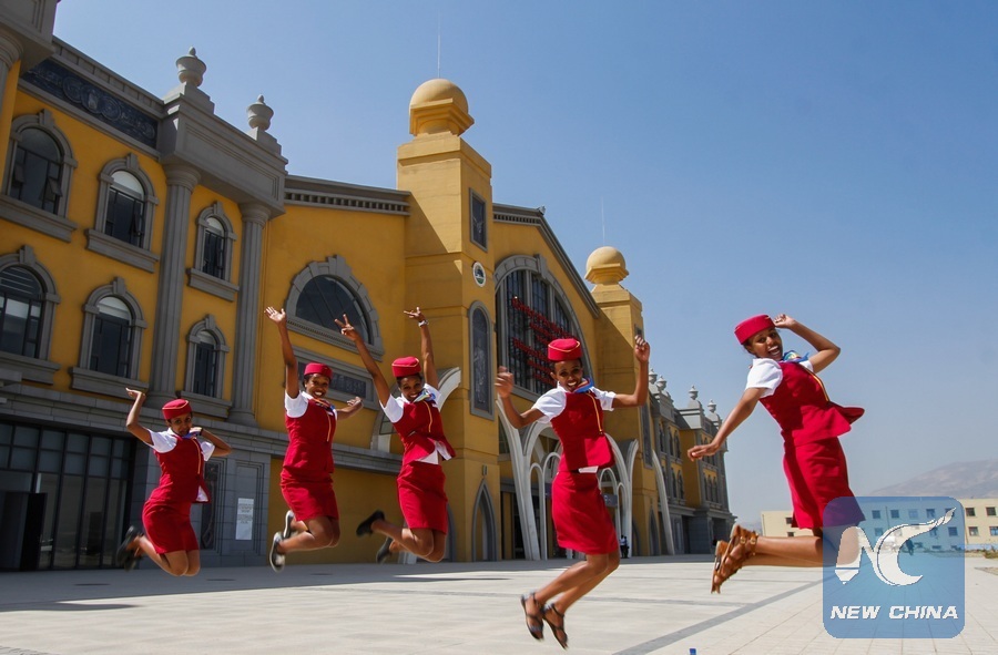 Ethiopian attendants jump at the Lebu station of the Chinese-built Ethio-Djibouti Railway in Addis Ababa, capital of Ethiopia, Jan. 1, 2018. (Xinhua/Michael Tewelde)