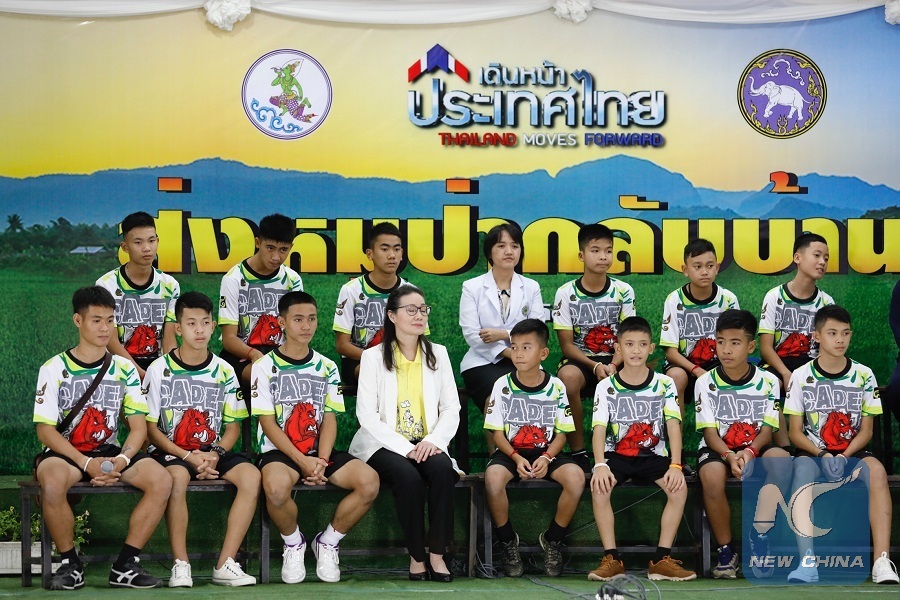 CHIANG RAI, Thailand, July 18 (Xinhua) -- The 12 Thai young footballers and their coach rescued from the flooded cave in northern Thailand made their public appearance on Wednesday, promising to be more careful and live their lives the fullest.