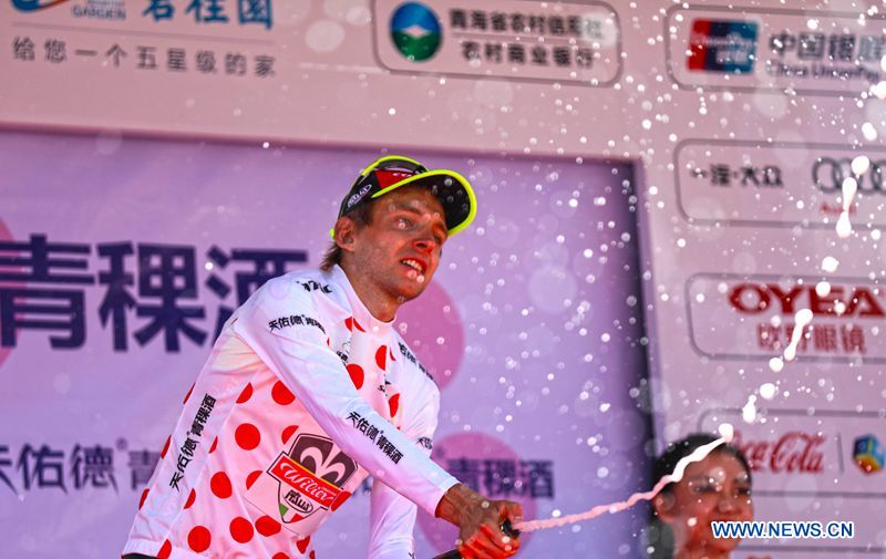 Ilia Koshevoy from Italian Wilier Triestina-Southeast Team (WIL) celebrates with the polka-dot jersey at the award ceremony of the third stage of the Tour of Qinghai Lake in northwest China's Qinghai Province, on July 24, 2018.?(Xinhuanet Photo by Yang Shoude)