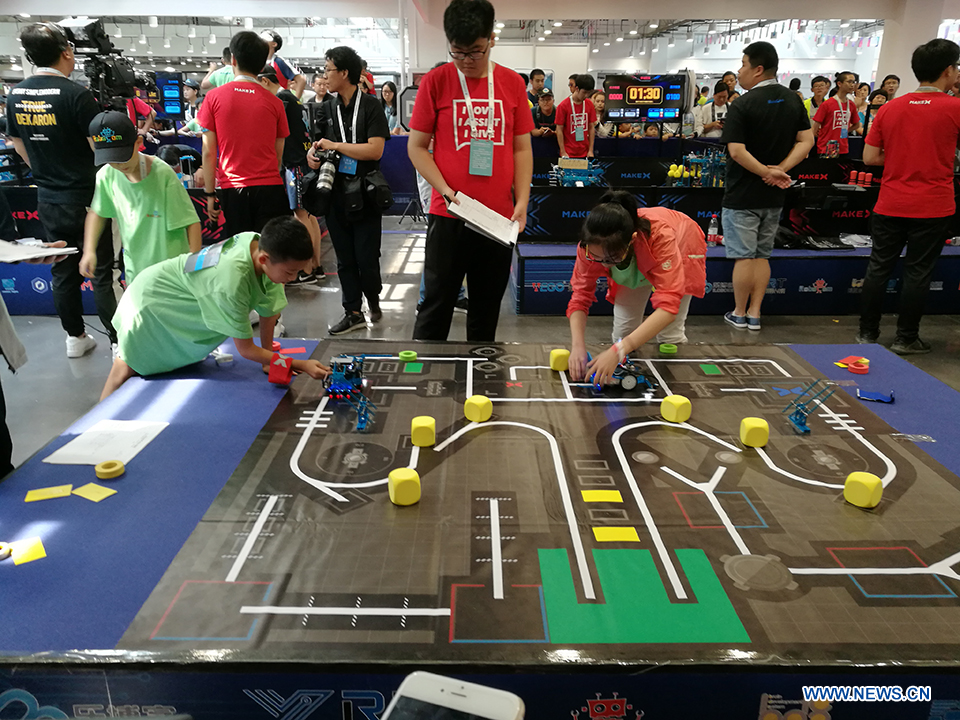 Participants compete during a contest at the 2018 World Robot Conference in Beijing, Aug. 17, 2018. The conference attracts a total of 166 domestic and international enterprises exhibiting their cutting edge technologies and more than 500 items are displayed at the scene. (Xinhuanet/Yang Pengzhan)