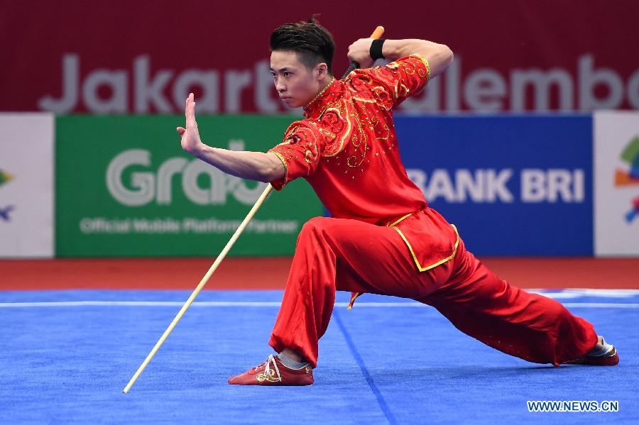 Wu Zhaohua of China competes during the Gunshu competition of Men's Daoshu & Gunshu All-Round at the 18th Asian Games in Jakarta, Indonesia, Aug. 21, 2018. Wu Zhaohua won the gold medal. (Xinhua/Cheong Kam Ka)
