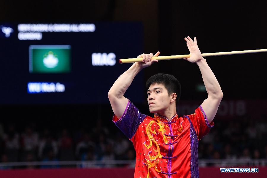 Wu Nok In of China's Macao competes during the Gunshu competition of Men's Daoshu & Gunshu All-Round at the 18th Asian Games in Jakarta, Indonesia, Aug. 21, 2018. (Xinhua/Cheong Kam Ka)