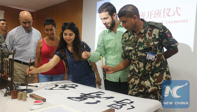 Military personnel of the United Nation Interim Force in Lebanon (UNIFIL) are learning Chinese traditional calligraphy in Chinese language course on Aug. 23, 2018 at the headquarter of UNIFIL in Beirut. (Xinhua)