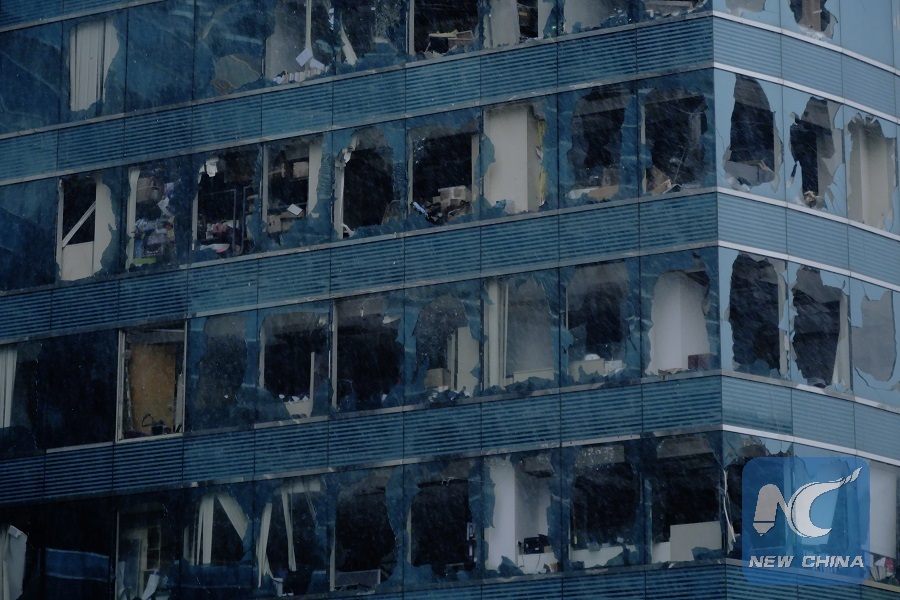 Photo taken on Sept. 16, 2018 shows damaged windows of a building in Hong Kong, south China. (Xinhua/Wang Shen)