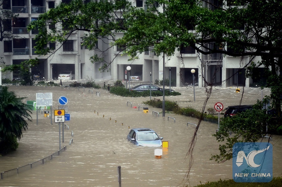 Photo taken on Sept. 16, 2018 shows a waterlogged road in Hong Kong, south China. (Xinhua/Lo Ping Fai)