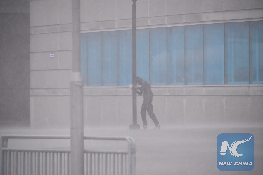 A pedestrian walks against storm in Hong Kong, south China, Sept. 16, 2018. (Xinhua/Lui Siu Wai)