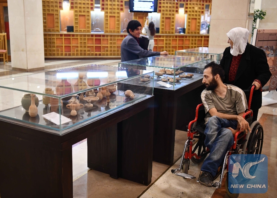 Restored antiquities are displayed during an exhibition organized by the Directorate-General of Antiquities and Museums in Damascus, Syria, on Oct. 3, 2018. (Xinhua/Ammar Safarjalani)