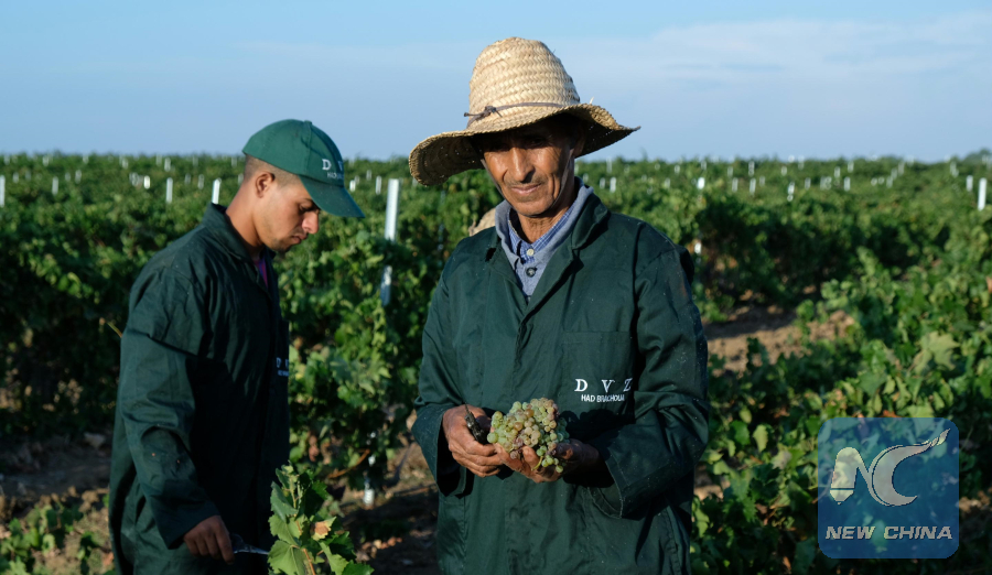 Employees at Red Farm winery pick up grapes in Morocco's western town of Rommani, on Oct. 1, 2018. (Xinhua/Chen Binjie)
