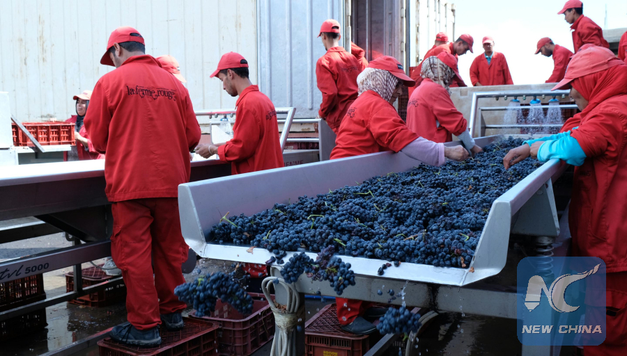 Employees at Red Farm winery clean and process the harvested grapes in Morocco's western town of Rommani, on Oct. 1, 2018. (Xinhua/Chen Binjie)