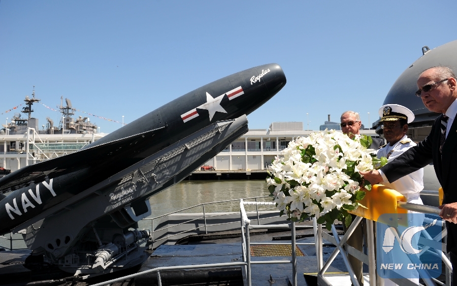 File Photo: Three veterans of USS Nuclear Submarine "Growler" (SSG 577), Melvin Williams (C), Dan Gillcrist (R) and Torykian lay a commemorative wreath into the water beside the submarine Growler at the Intrepid Sea, Air & Space Museum, Manhattan, New York, the United States, May 21, 2009. Commissioned in 1958 and on active duty through 1964, USS Growler carried nuclear missiles and performed deterrent mission patrols in the Pacific Ocean. (Xinhua/Gu Xinrong)