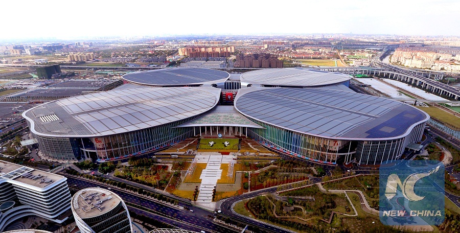 Aerial photo taken on Oct. 19, 2018 shows the National Exhibition and Convention Center (Shanghai), the main venue of the upcoming first China International Import Expo (CIIE), in Shanghai, east China. (Xinhua/Fan Jun)