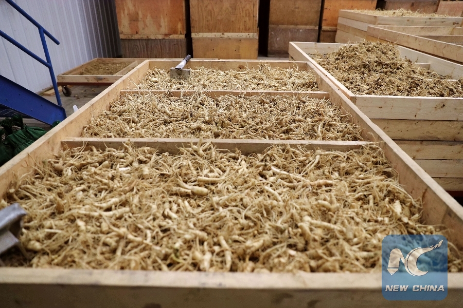 Picture taken on Oct. 22, 2018 shows ginseng dried up in a workplace of Baumann Ginseng company in Marathon County, Wisconsin, the United States. (Xinhua/Wang Ping)