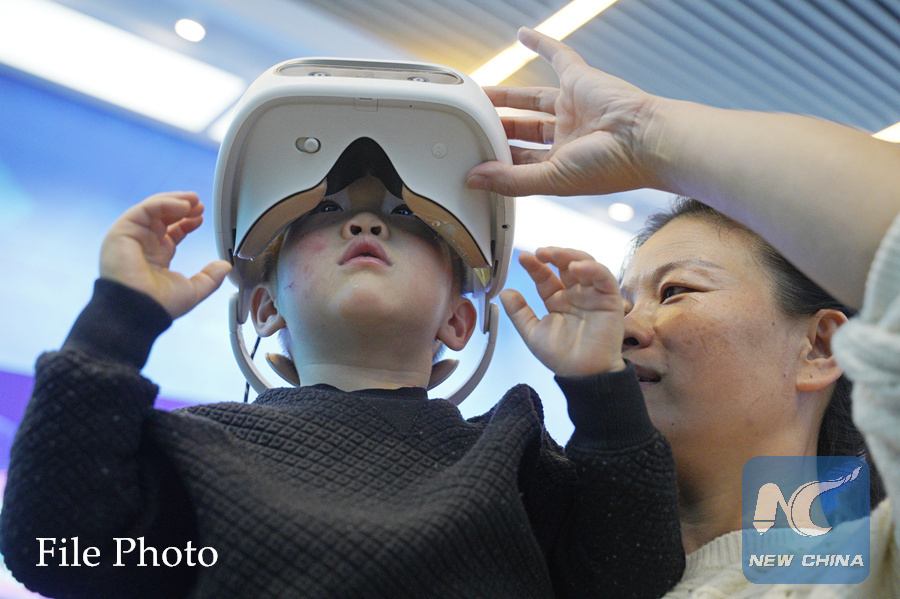 A child experiences a virtual reality project during a major exhibition to commemorate the 40th anniversary of China's reform and opening-up at the National Museum of China in Beijing, capital of China, Nov. 22, 2018. (Xinhua/Cai Yang)
