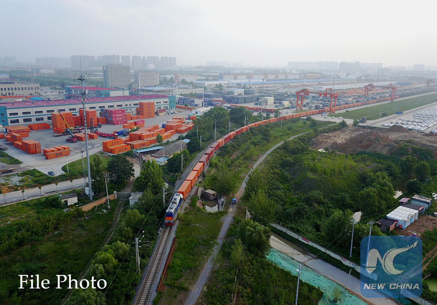 A China-Europe freight train departs the station in Zhengzhou City, capital of central China's Henan Province, Aug. 2, 2017. (Xinhua/Li An)