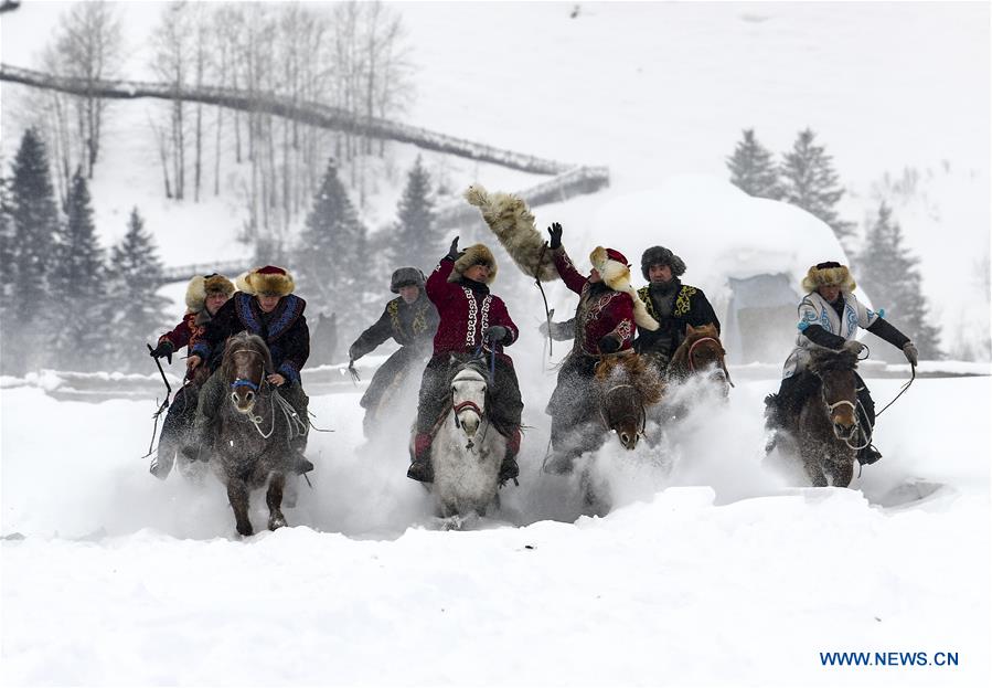 Residents perform a horse race during an ice and snow festival in Hemu Village of Kanas, northwest China's Xinjiang Uygur Autonomous Region, Jan. 1, 2019. Various activities were held across China to greet the year of 2019. (Xinhua/Zhao Ge)