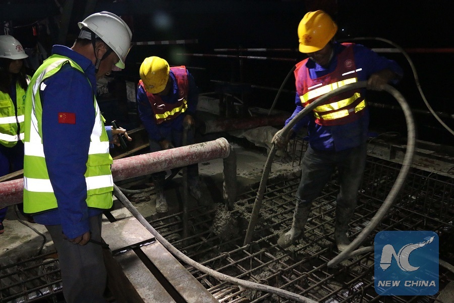Chinese workers cast concrete at the site of the first cast-in-place continuous beam of the China-Laos railway at the under-construction Nathon Station Double-track Super Major Bridge, some 360 km north of Vientiane, capital of Laos, on Jan. 19, 2019. (Xinhua/Huang Zongwen)