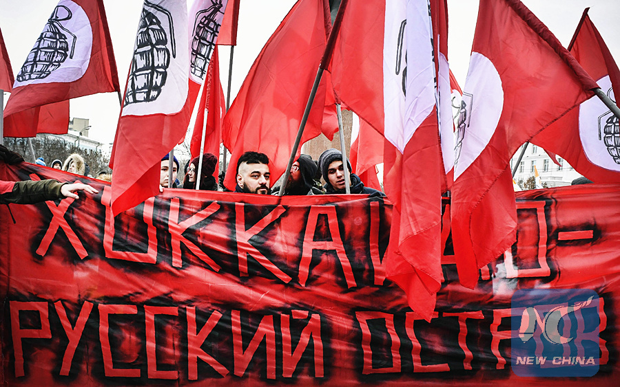 Protestors hold a protest in Moscow on January 20, 2019, demanding to stop talks on assignation Kuril islands to Japan. (AFP)