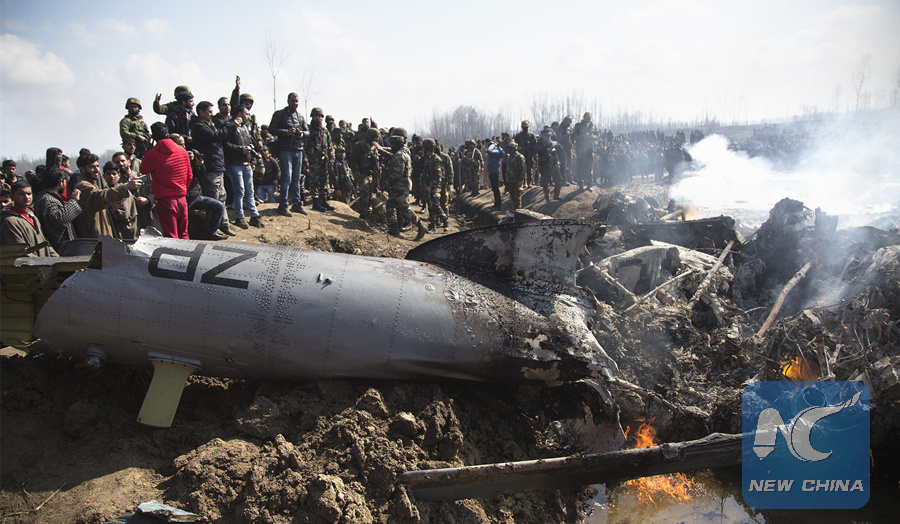 People and Indian army troops gather near the wreckage of an Indian aircraft after it crashed about 34 kilometers south of Srinagar, Indian-controlled Kashmir, Feb. 27, 2019. (Xinhua)