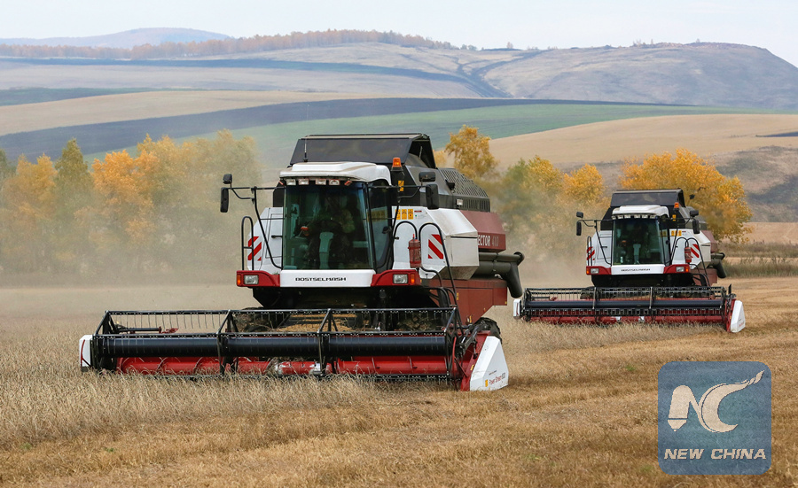 Combines harvest wheat in a field of the Svetlolobovskoye farm in the Krasnoyarsk region, Siberia, Russia, September 29, 2018. (REUTERS)