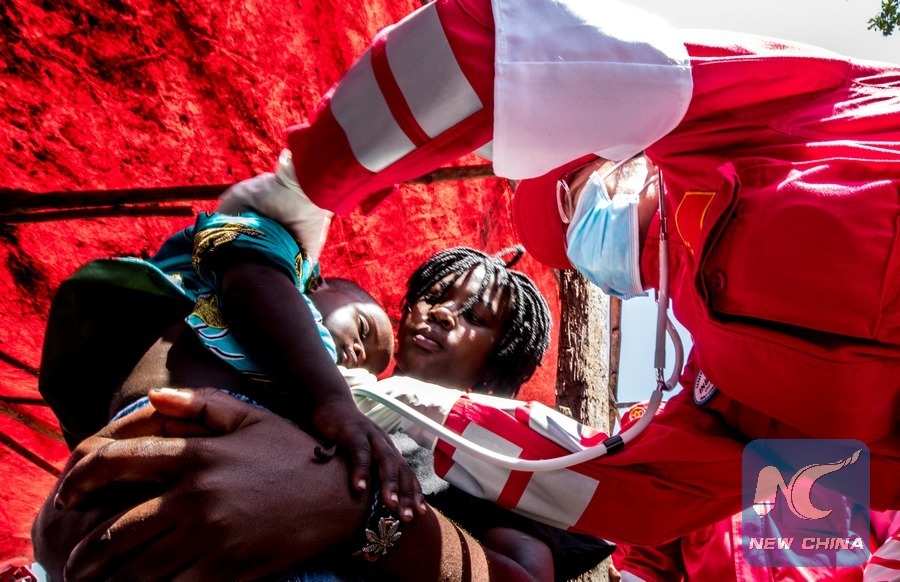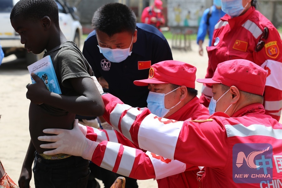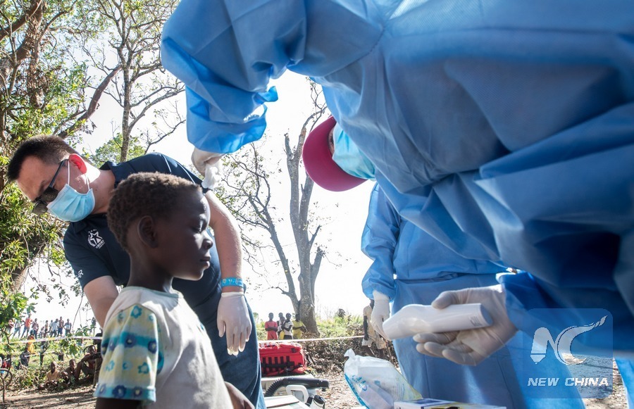 Medical members of Chinese rescue team give health examination to a boy at a temporary shelter for victims of Cyclone Idai in Beira, Mozambique, March 27, 2019. The Chinese rescue team has been delivering humanitarian aid in central Mozambique since Monday after Cyclone Idai wreaked havoc in the southeastern African country. (Xinhua/Nie Zuguo)