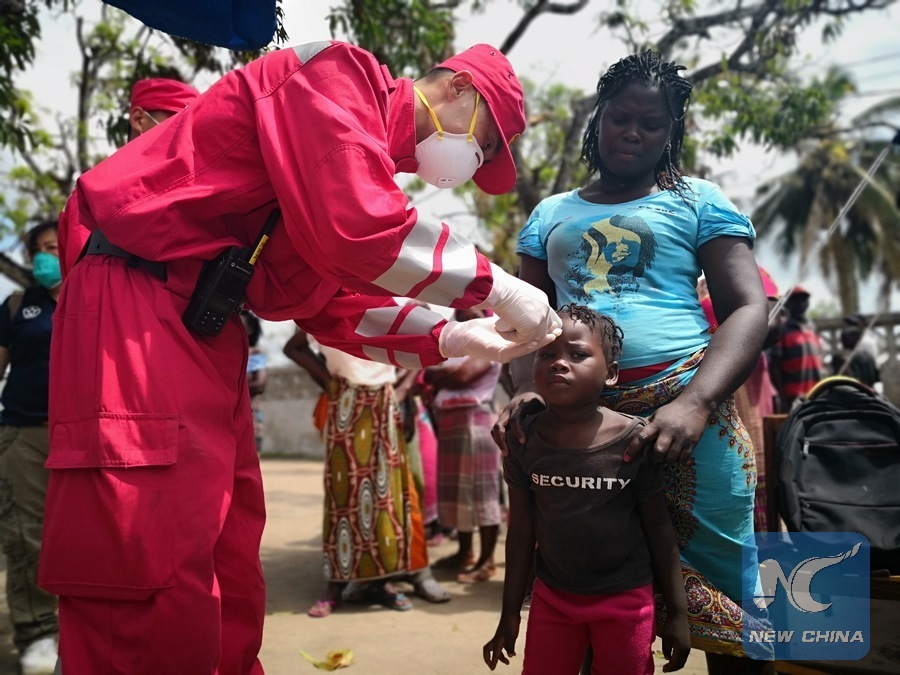 A medical member of Chinese rescue team measures body temperature for a boy at a resettlement site for victims of Cyclone Idai, about 70 kilometers from Beira, Mozambique, March 27, 2019. (Xinhua/Zhang Yu)