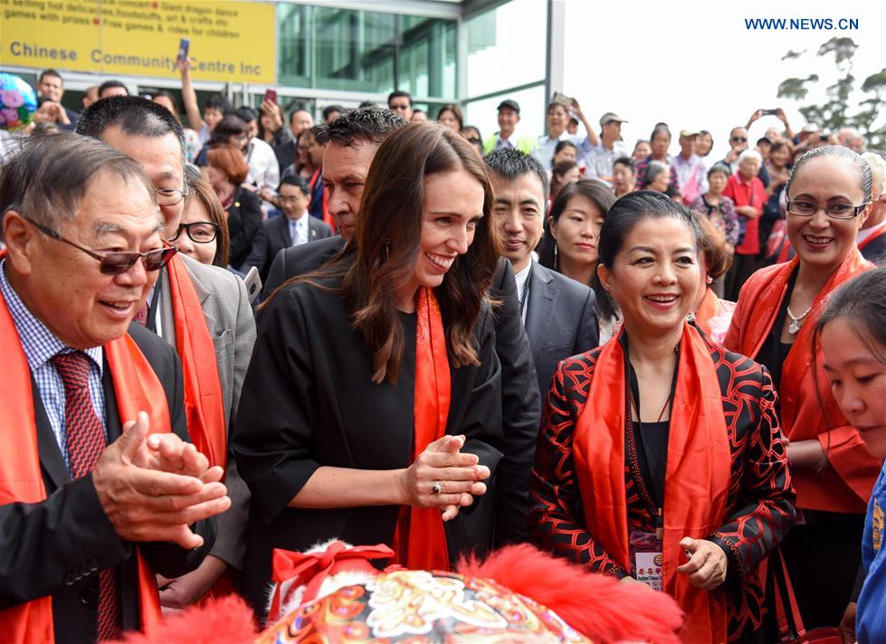New Zealand Prime Minister Jacinda Ardern and Chinese Consul General in Auckland Xu Erwen participate in the 2019 Chinese New Year Festival and Market Day in Auckland, New Zealand, Feb. 2, 2019. (Xinhua/Guo Lei)