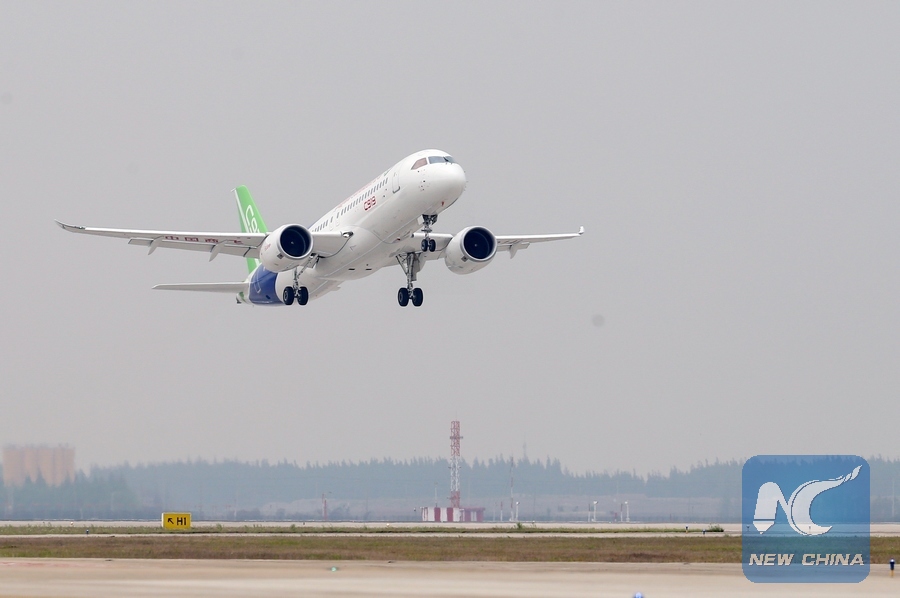 China's homegrown large passenger plane C919 takes off on its maiden flight in Shanghai, east China, May 5, 2017. (Xinhua/Ding Ting)