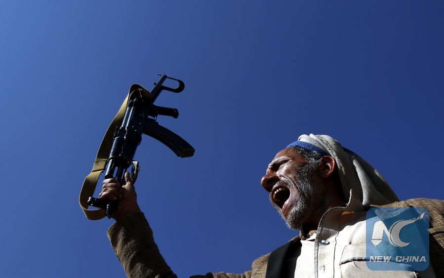 A Houthi loyalist takes part in a gathering to support the peace talks held in Sweden, in Sanaa, Yemen, on Dec. 13 , 2018. (Xinhua/Mohammed Mohammed)