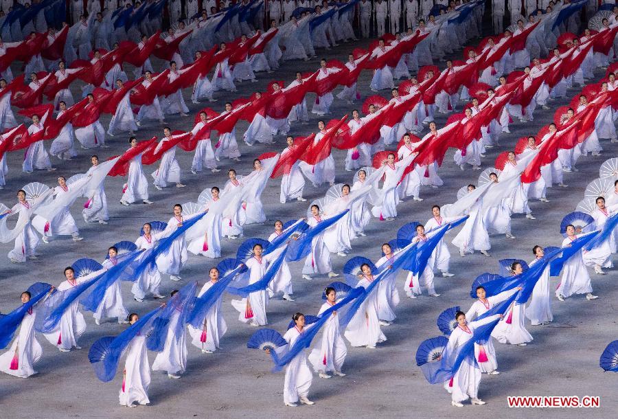 A large group callisthenics and art performance is held at the May Day Stadium in Pyongyang, DPRK, June 20, 2019. Xi Jinping, general secretary of the Central Committee of the Communist Party of China (CPC) and Chinese president, and his wife Peng Liyuan, accompanied by Kim Jong Un, chairman of the Workers' Party of Korea (WPK) and chairman of the State Affairs Commission of the Democratic People's Republic of Korea (DPRK) and his wife Ri Sol Ju, watched the perfromance here on Thursday. (Xinhua/Shen Hong)