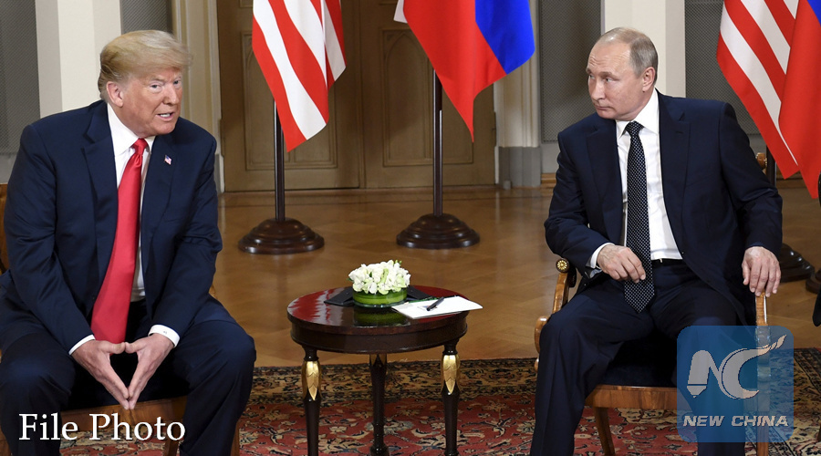 U.S. President Donald Trump (L) meets with his Russian counterpart Vladimir Putin in Helsinki, Finland, on July 16, 2018. (Xinhua/Lehtikuva/Heikki Saukkomaa)