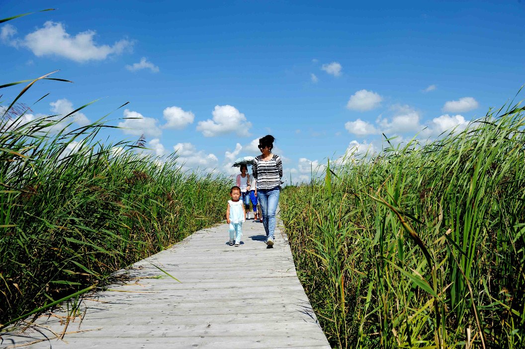Tourists visit Zhalong National Nature Reserve in Qiqihar, northeast China's Heilongjiang Province, Aug. 1, 2018.(Xinhua/Wang Kai)