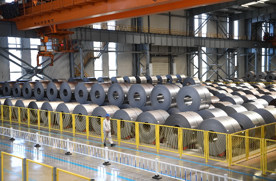 A worker of HBIS Group Tangsteel Company patrols at the steel coil storage area in Tangshan, north China's Hebei Province, May 31, 2019. (Xinhua/Mu Yu)