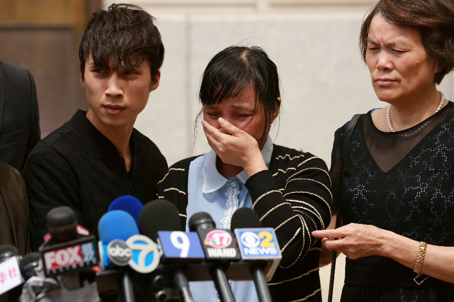 Zhang Yingying's family members meet the press near the federal courthouse building in Peoria, Illinois, the United States, on June 24, 2019. (Xinhua/Wang Ping)