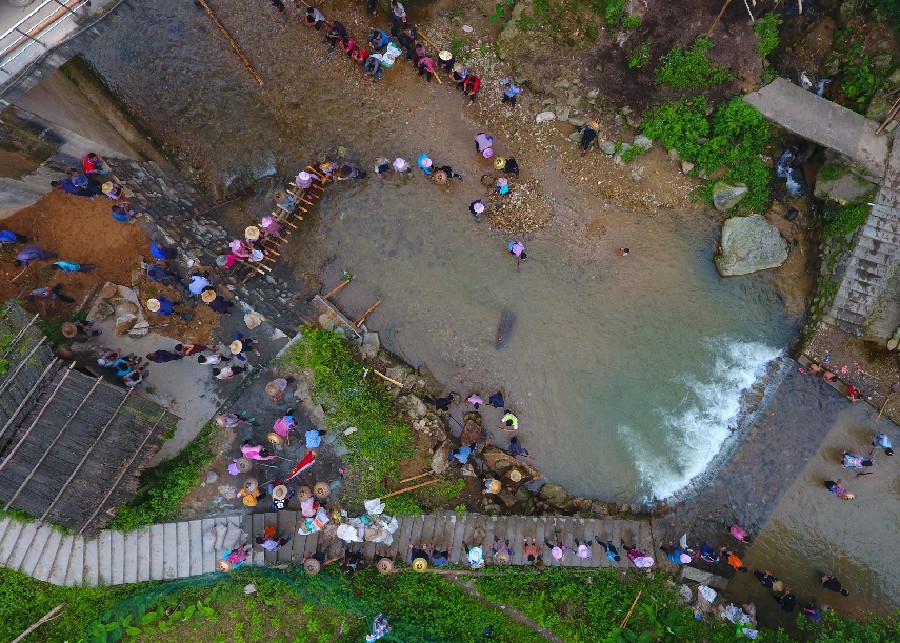 In this aerial photo taken on July 3, 2019, poverty alleviation officials join villagers to build a river dam in Wuying Village of Rongshui Miao Autonomous County, Liuzhou, south China's Guangxi Zhuang Autonomous Region. (Xinhua/Huang Xiaobang)