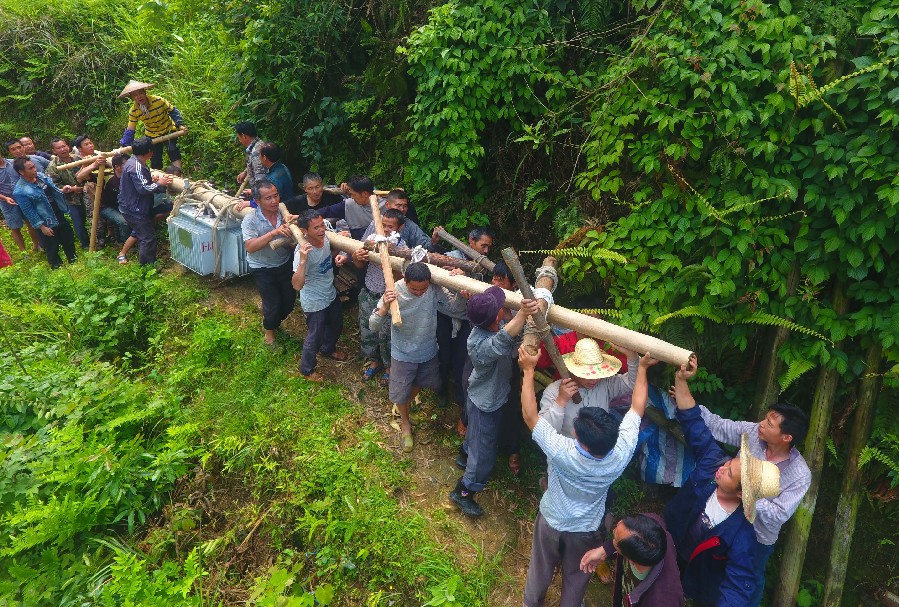 In this aerial photo taken on April 25, 2019, poverty alleviation officials and villagers are seen on their way to replace a voltage transformer in Dangjiu Village of Rongshui Miao Autonomous County, Liuzhou, south China's Guangxi Zhuang Autonomous Region. (Xinhua/Huang Xiaobang)